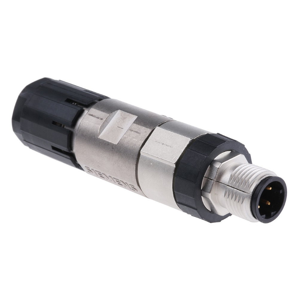A rugged M12 plug connector designed for fast, secure assembly with FastConnect systems, compatible with SCALANCE X208 PRO, ET 200 PRO PN, and ET 200 eco PN modules. Engineered with a durable metal enclosure and axial cable outlet, this D-coded connector ensures reliable networking in industrial environments.